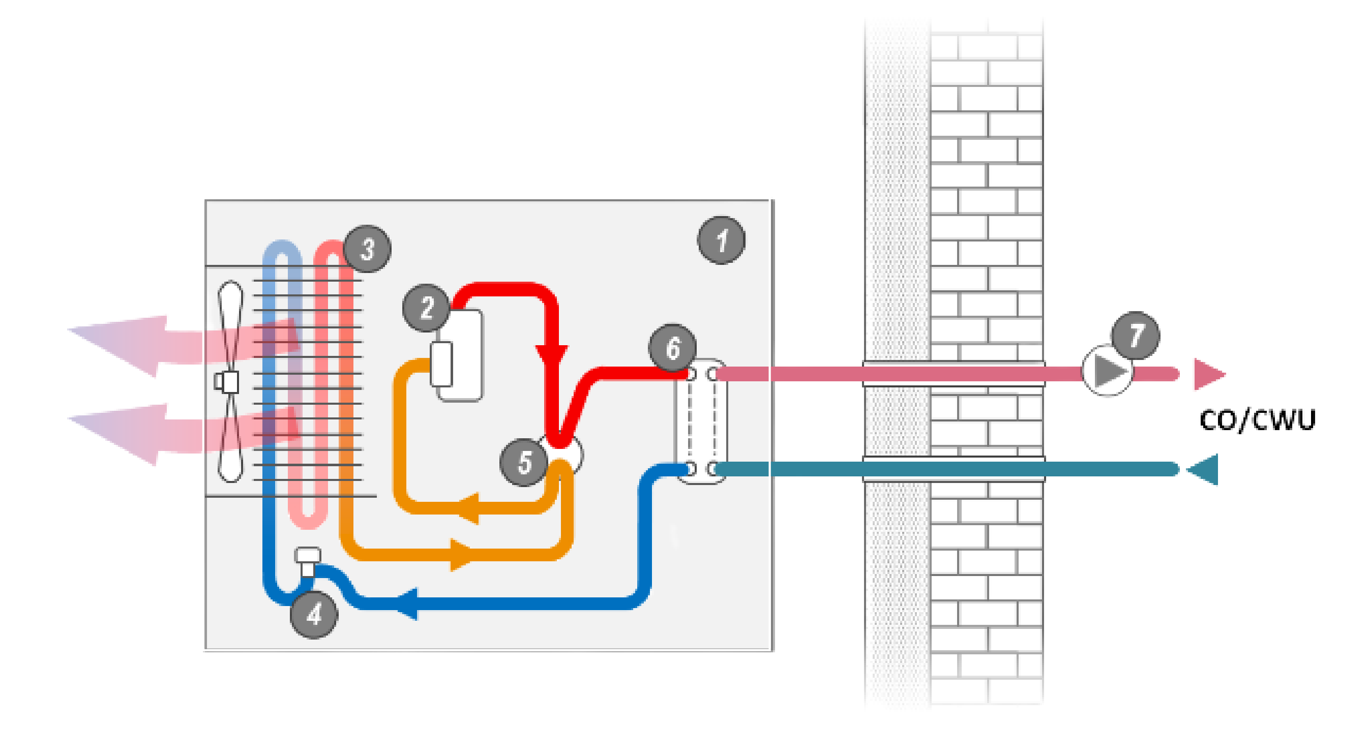 Czynnik chłodniczy o podwyższonej temperaturze i ciśnieniu oddaje ciepło w skraplaczu i poprzez elektroniczny zawór rozprężny powraca do parownika. Woda grzewa odbiera z czynnika chłodniczego ciepło w skraplaczu. Pompa obiegowa kieruje wode do instalacji grzewczej.